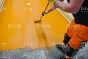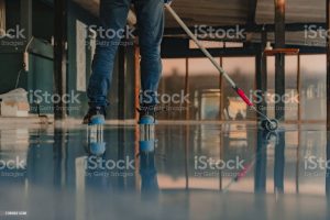 Worker applying epoxy and polyurethane flooring system.These easy-to-clean products also have non-slip features.